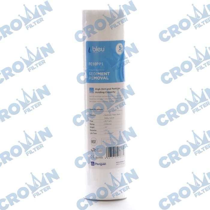 Bleu by Penguin CTO Cartridge FC10PP.Kartrid sedimen propilena ini memiliki kapasitas penahan kotoran yang lebih besar dan tidak meninggalkan residu kimia.Spesifikasi :Function : Sedimen, Pasir, Karat, Debu & Lumut.Flow : 20,7 LPMRating : 5 micronHeight : 10 inchDiameter : 2,5"Lifetime : 2-3