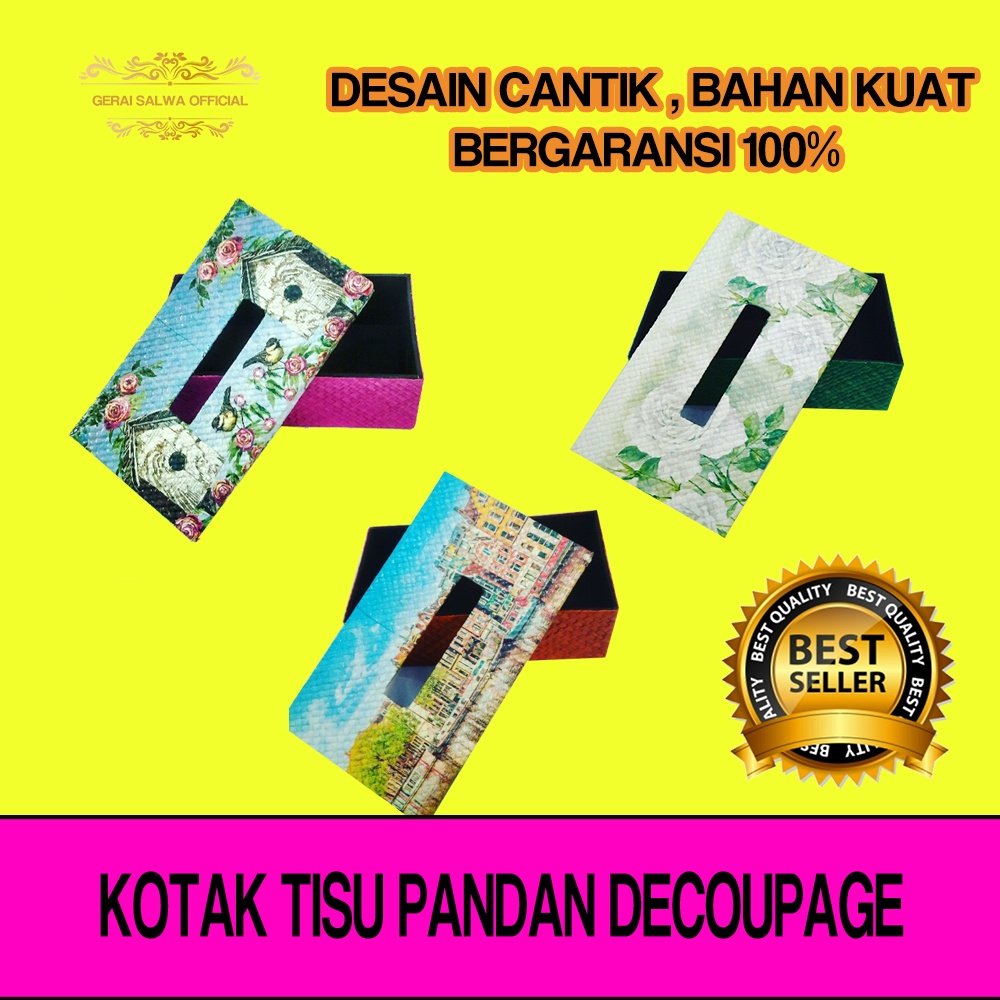 Tempat tisu terbuat dari bahan karton tebal di lapisi dengan anyaman pandan dan aksesoris yang di tempelkanCocok disimpan di meja ruang tamu, meja makan, kamar tidur bahkan di dalam mobil anda supaya terkesan unik UKURAN KOTAK TISUPanjang : -+ 25 cmLebar : -+ 13,5 cmTinggi : -+ 7,5 cmBerat : -+ 167 gram 1 Kg muat 2 Pcs ya kak (pack)#Solusi penyimpanan tisu keki