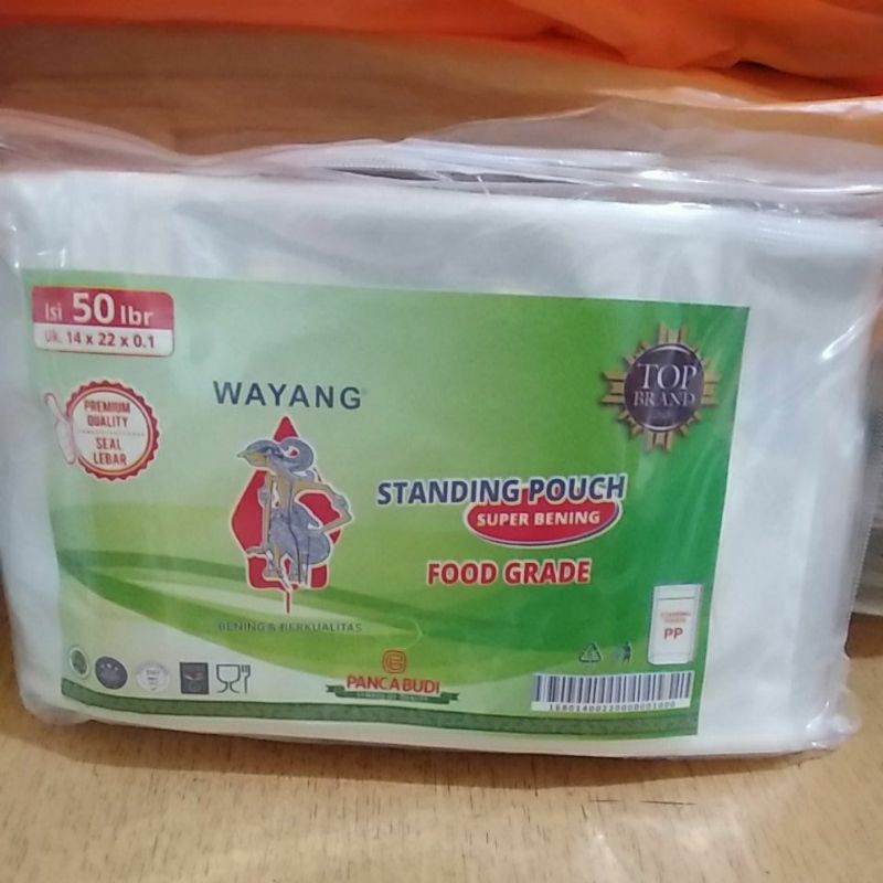 Standing Pouch 14x22x0,1merek Wayangplastik klip bisa duduk, cocok Untuk aneka macam kue kering1pak isi 5