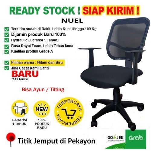 Kursi Kerja Kantor Jaring NuelKursi NUEL ini bisa menjadi pilihan untuk Anda masukkan ke dalam keranjang belanja, mengingat kontruksi kaki dan roda yang kuat dan bisa menahan beban hingga 100 kg, serta mekanisme ayun yang menyamankan waktu bekerja Anda. Spesifikasi : - Kaki dan Roda Jamin Kuat hingga 100kg , Dengan mekanis ayun- Tinggi Dudukan ( Posisi Rendah, Diukur dari lantai ke dudukan ) = 38 cm- Tinggi Dudukan ( Posisi Tinggi, Diukur dari lantai ke dudukan ) = 48 cm- Warna Hitam dan Biru- Barang sudah dirakit tinggal masukkan kaki saja tanpa obeng.- (Terhindar dari rusak karena salah pasang)- Garansi Hidrolik 1 TahunNote : - Khusus untuk wilayah jabodetabek ada beberapa produk yang bisa menggunakan via go-send. - Pembelian diluar jabodetabek dikenakan ongkir tambahan karena menggunakan berat asli. - Pesanan hari ini paling lambat akan dikirim keesokan harinya.- Sebelum melakukian pemesanan harap kontak kami terlebih dah