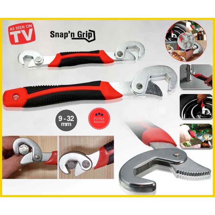 Kini kamu nggak perlu lagi ribet mengoleksi banyak kunci pas untuk memperbaiki berbagai peralatan di rumah. Cukup dengan Snap n Grip, kamu bisa memperbaiki berbagai peralatan, mulai dari keran, pipa, garis, radiator, hingga roda mobil sekalipun. Kunci Inggris multifungsi ini terdiri dari dua kunci pas universal yang bisa kamu gunakan untuk melonggarkan atau mengencangkan semua jenis baut berbagai ukuran dan bentuk.Dengan bentuknya yang kecil, Snap n Grip ini bisa dengan mudah kamu simpan dan bawa saat bepergian, bahkan bisa disimpan di bawah jok motor dan mobil. Pastinya lebih praktis dan mudah karena kamu tidak perlu lagi membeli banyak kunci pas. Yuk dapatkan Snap n Grip dengan harga yang lebih murah di sini!Snap N Grip!Fungsi dan kegunaan :1. Snap n grip adalah sistem yang inovatif yang terdiri dari dua kunci pas universal,\2. Dapat mengencangkan dan melonggarkan segala jenis mur3. Dapat mengencakan dan melepas mur dari ukuran 8mm - 32mm !Spesifikasi2 kunci pas universal untuk semua mur dan bautEfisien, praktis dan mudah digunakan Seketika mengurus semua pekerjaanKini kamu nggak perlu lagi ribet mengoleksi banyak kunci pas untuk memperbaiki berbagai peralatan di rumah. Cukup dengan Snap n Grip, kamu bisa memperbaiki berbagai peralatan, mulai dari keran, pipa, garis, radiator, hingga roda mobil sekalipun. Kunci Inggris multifungsi ini terdiri dari dua kunci pas universal yang bisa kamu gunakan untuk melonggarkan atau mengencangkan semua jenis baut berbagai ukuran dan bentuk.Dengan bentuknya yang kecil, Snap n Grip ini bisa dengan mudah kamu simpan dan bawa saat bepergian, bahkan bisa disimpan di bawah jok motor dan mobil. Pastinya lebih praktis dan mudah karena kamu tidak perlu lagi membeli banyak kunci pas. Yuk dapatkan Snap n Grip dengan harga yang lebih murah di