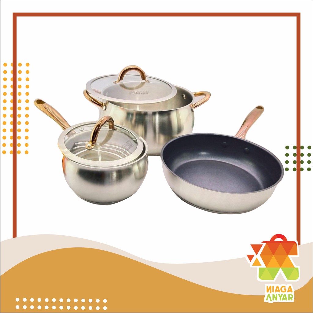 PERHATIAN!!1. Silahkan beli tambahan bubble untuk pengiriman yang lebih aman (baca juga ketentuan di page bubble wrap) https://shopee.co.id/product/3188474/377405693/2. Silahkan baca dahulu jadwal dan ketentuan pengiriman yang ada di profile page kami dengan cara klik "kunjungi toko"3. Ketidaktahuan akibat tidak membaca informasi tersebut bukan tanggung jawab kamiNAKAMI Panci Set 5 Pcs NK 5000K :-. Dapat digunakan untuk semua jenis kompor termasuk kompor Induksi-. Dapat digunakan dengan Utensil berbahan Metal-. Oven Safe to 260*C-. Dishwasher Safe-. Non-Stick Coating Frying Pan-. 1 Saucepan (16x9,5cm) + Glass Lid-. 1 Casserole (24x13,5cm) + Glass Lid-. 1 Frying Pan (24x6