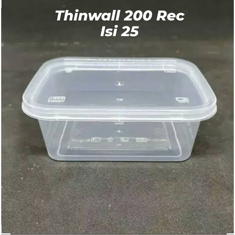 Thinwall 200ml Rectangel / persegi panjangIsi per pack 25Harga per satuan pack sudah termasuk tutupSPECS: - Bahan: PP Thinwall - Ukuran: 200ml - - Dimensi: 8x10.5x4cm - Isi: 25