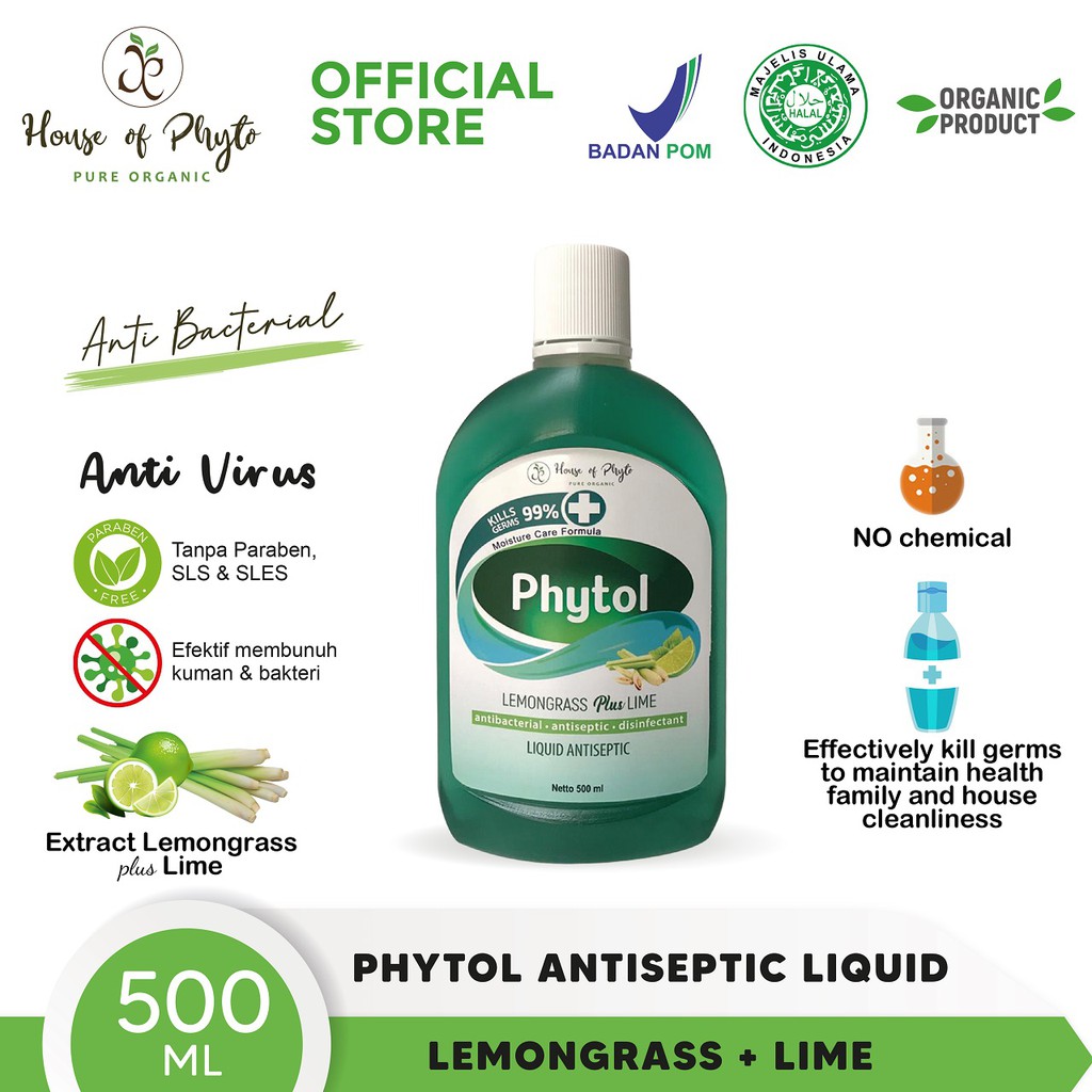 Phyto - Organic Phytol Antiseptic [Bundling]EXP 0623Dari harga Rp 180.000 menjadi Rp 150.0001. Phytol Antiseptic Lemongrass Plus Lime 500ml2. Phytol Antiseptic Tea Tree Plus Orange 500ml1. Phytol - Lemongrass Plus Lime - Liquid AntisepticCairan Antiseptik yang efektif membunuh kuman dengan bahan Lemongrass dan Lime yang tidak membuat kulit kering.2. Cairan Antiseptik yang efektif membunuh kuman dengan bahan Tea Tree dan Orange yang tidak membuat kulit kering. Cara penggunaan:Sebagai antiseptik tubuh, berguna untuk keluarga dari semua umur.Larutkan 1 tutup penuh ke dalam bak mandi.Penggunaan Lainnya:1. Membersihkan luka2. Disinfectant pada popok dan pakaian bayi3. Menghilangkan bau4. Membunuh kuman di lantai5. Mencuci pakaian dan mencegah infeksi kumanPERHATIAN:Jauhkan dari jangkauan anak - anak. Bila terkena mata bilas dan bila terjadi iritasi hentikan penggunaan. Bila terminum, minumlah air yang banyak serta segera hubungi dokter.Diproduksi Oleh:PT. Global Beauty ScienceTangerang - 15710 - IndonesiaDidistribusikan Oleh:PT Kreasi Cantik AlamiHouse of PhytoJakartaKEMENKES RI PKD 20503021430EXP : 0623Made in Indonesia#antibacterial #antiseptic #disinfe