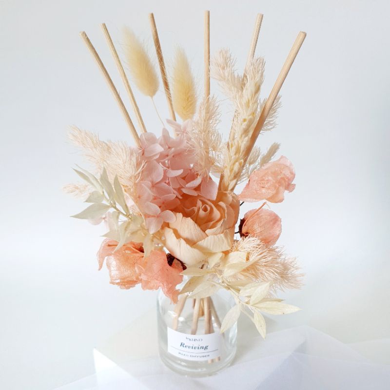FLORAL BOUQUET DIFFUSERis now available What you get:• 50ml aromatherapy oil (10 choices of aroma)• Lux bottle with gold cap• 6 rattan sticks• Dried Flowers bouquet• Hard box + ribbonPilihan aroma reed diffuser:• Ginger Ale - Ginger x Lemon x Mandarin. Boost confidence, comforts & energize mind.• Lavandula - reduce stress, promote calmness & wellness. Mix of lavender + vanilla beans.• Lemongrass - reduce anxiety & tension, promote calmness• Dew tea - fresh morning aroma, relax mind, relieve stress & improve focus. Combination of green tea, orange, &lemon.• Chandana - combination of sandalwood & rose. Aroma kayu candana yang mewah dan menenangkan, serta rose yang emotionally soothing.• Reviving - refreshing fruits, sweet & floral aroma. offers uplifting sensation and cheering. combination of pear & freesia.• Eden's garden - green floral aroma. Aroma yang menyegarkan cocok untuk stay fresh diiklim tropis! combination of grapefruit, cucumber, green apple, & amber.• Coconut - Nutty, vanilla milk, sweet. Reduces stress and can make relaxation at the end of the day.• Relief - soothing and calming aroma. combinations of eucalptus & sweet roman chamomile.• Peppermint - peppermint x citrus. The aroma can boost your body's production of seratonin, a hormone that makes you feel happy but still feel