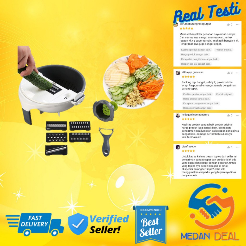Multifungsi Parutan Serbaguna Pemotong Sayuran, dll, merupakan alat yang berfungsi untuk memotong aneka macam sayuran dan buah dengan lebih cepat dan praktis, alat ini sangat cocok untuk Anda yang hoby food craving, memasak di dapur, dan pengusaha restaurant,memotong sayuran dan buah buahan menjadi sangat cepat dengan hasil potongan yang merata, dan dapat menghemat waktu anda.Alat Pemotong Sayuran 7 In 1 Multifungsi Parutan multifungsi dilengkapi dengan 6 mata pisau yang sangat tajam, mampu memotong berbagai macam buah dan sayuran dengan lebih cepat, Anda tidak perlu takut lagi tangan anda teriris pisau karena dilengkapi dengan holder accesories yang dapat digunakan untuk menempatkan buah / sayur.Fitur produk :1. 1 varian warna2. Dilengkapi dengan 6 jenis mata pisau.3. Setiap mata pisau terbuat dari bahan stainless steel anti karat dan tajam.4. Higienis dan aman karena sudah BPA FREE & Food Grade.5. Dilengkapi dengan Holder Accessoris & Peel Accessoris (alat kupas). 6. Menghemat waktu memasak anda.7. Mempercantikan tampilan masakan anda.ukuran12x 24,5cm